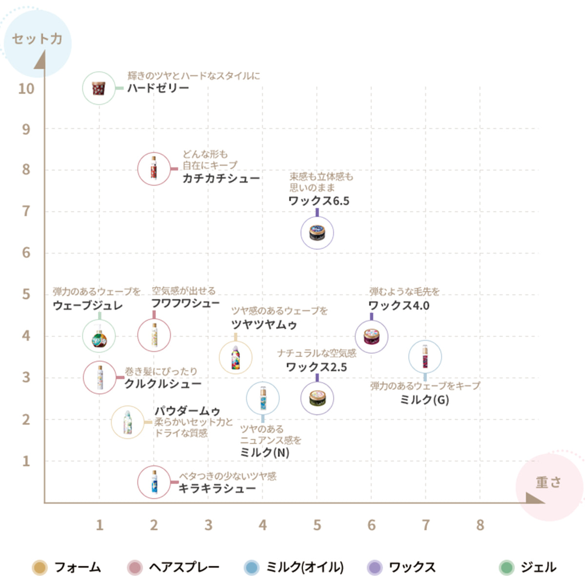 基材臭が少なくやさしい香りを最大限活かせる上に、セット力があるのにベタつきが少なく、さらさらすることが特長です。